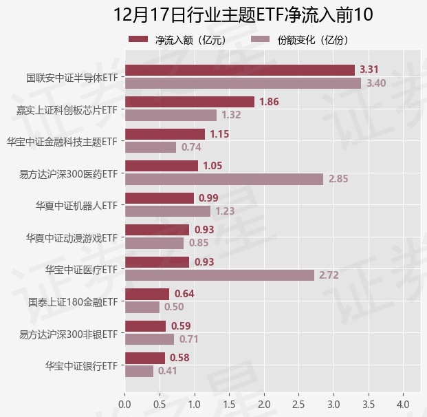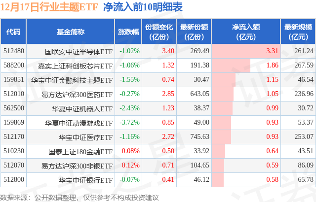 当日有128只行业主题ETF基金出现资金净流入,其中净流入排首位的是国联安中证半导体ETF(512480),份额增加了3.4亿份,净流入额为3.31亿元。