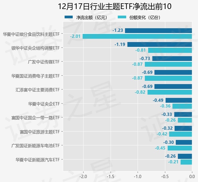 当日有108只行业主题ETF基金出现资金净流出,其中净流出排首位的是华夏中证细分食品饮料主题ETF(515170),份额减少了2.01亿份,净流出额为1.23亿元。