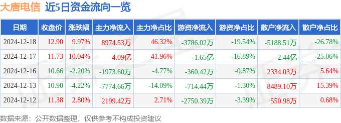 12月18日的资金流向数据方面,主力资金净流入8974.53万元,占总成交额46.32%,游资资金净流出3786.02万元,占总成交额19.54%,散户资金净流出5188.51万元,占总成交额26.78%。