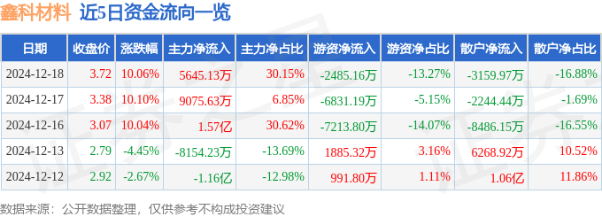 12月18日的资金流向数据方面,主力资金净流入5645.13万元,占总成交额30.15%,游资资金净流出2485.16万元,占总成交额13.27%,散户资金净流出3159.97万元,占总成交额16.88%。