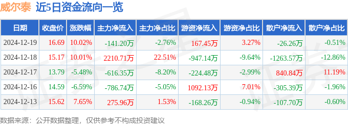 12月19日的资金流向数据方面,主力资金净流出141.2万元,占总成交额2.76%,游资资金净流入167.45万元,占总成交额3.27%,散户资金净流出26.26万元,占总成交额0.51%。