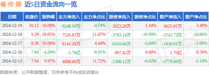 12月19日的资金流向数据方面,主力资金净流出9248.1万元,占总成交额4.74%,游资资金净流入2622.28万元,占总成交额1.34%,散户资金净流入6625.81万元,占总成交额3.4%。