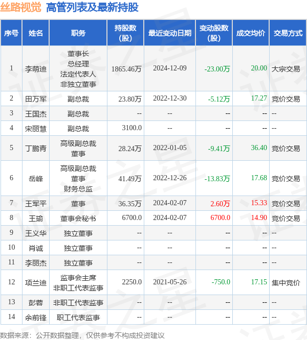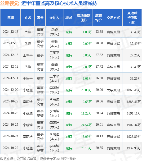 丝路视觉近半年内的董监高及核心技术人员增减持详情如下: