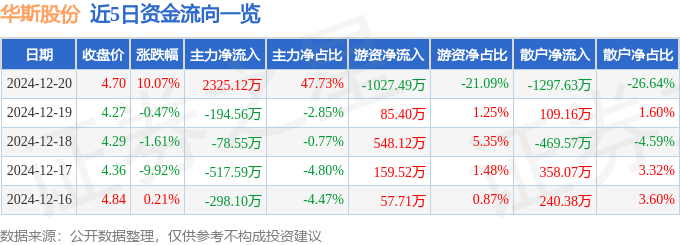 12月20日的资金流向数据方面,主力资金净流入2325.12万元,占总成交额47.73%,游资资金净流出1027.49万元,占总成交额21.09%,散户资金净流出1297.63万元,占总成交额26.64%。