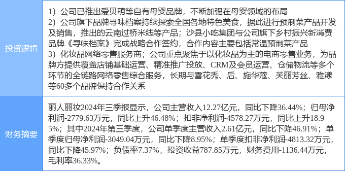 该股为化妆品,优化生育(三孩),预制菜概念热股,当日化妆品概念上涨2.72%,优化生育(三孩)概念上涨1.64%,预制菜概念上涨1.15%。