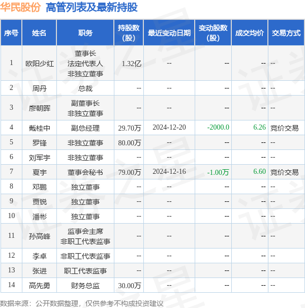 华民股份的高管列表及最新持股情况如下: