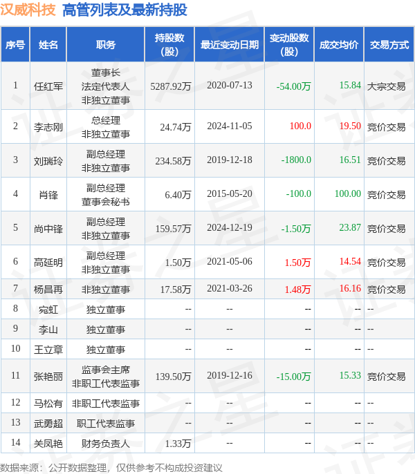 汉威科技的高管列表及最新持股情况如下: