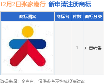 今年以来江苏张家港农村商业银行股份有限公司新申请注册商标1件,截止目前公司共持有注册商标152件,另有1件商标尚在注册申请中。
