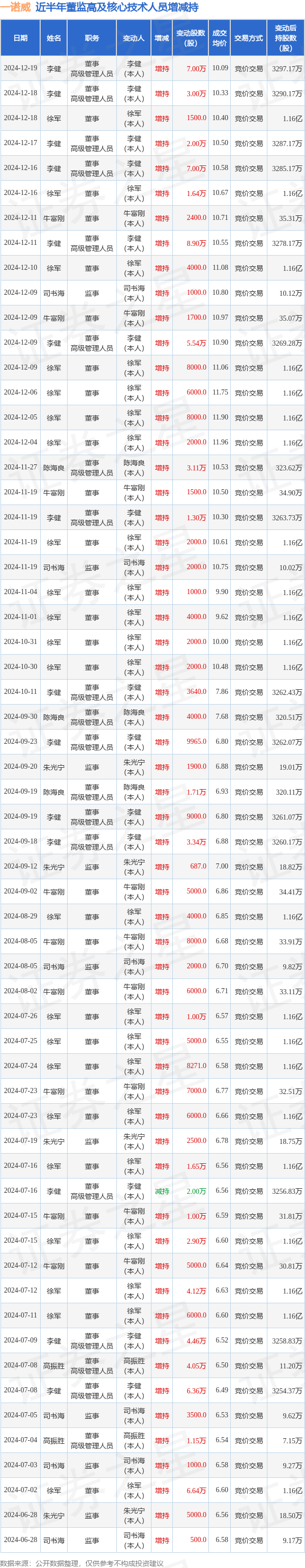 一诺威近半年内的董监高及核心技术人员增减持详情如下: