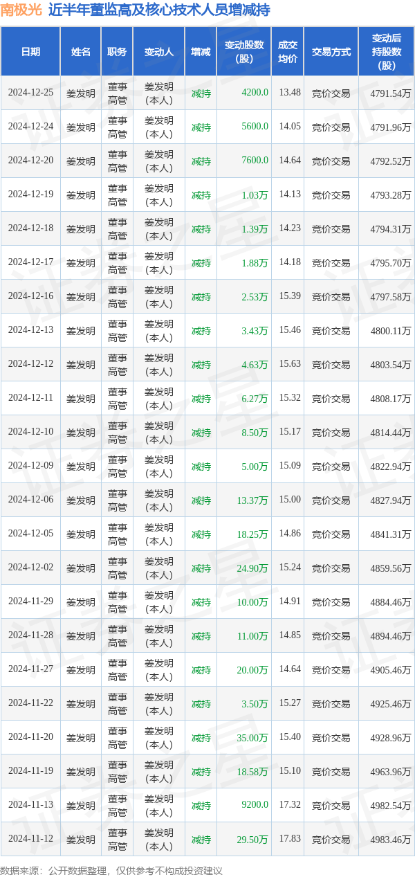 南极光近半年内的董监高及核心技术人员增减持详情如下: