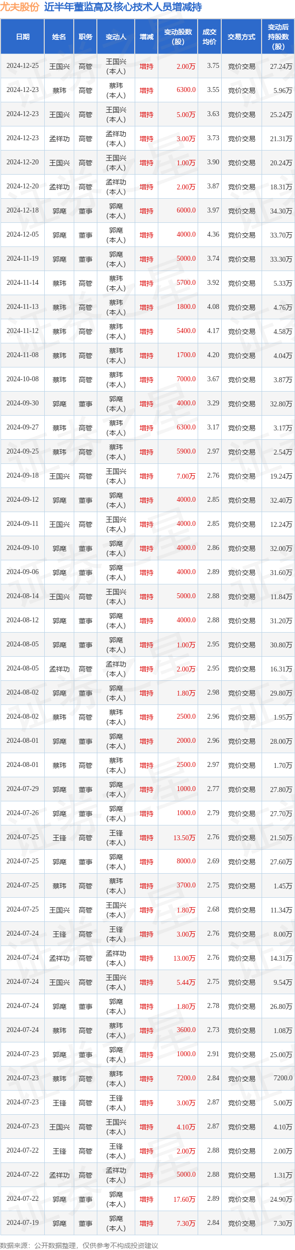 尤夫股份近半年内的董监高及核心技术人员增减持详情如下: