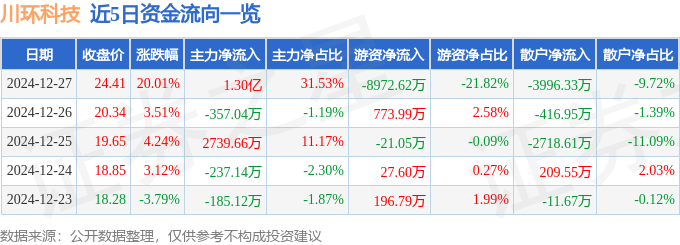 12月27日的资金流向数据方面,主力资金净流入1.3亿元,占总成交额31.53%,游资资金净流出8972.62万元,占总成交额21.82%,散户资金净流出3996.33万元,占总成交额9.72%。
