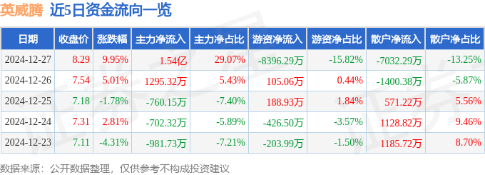 12月27日的资金流向数据方面,主力资金净流入1.54亿元,占总成交额29.07%,游资资金净流出8396.29万元,占总成交额15.82%,散户资金净流出7032.29万元,占总成交额13.25%。