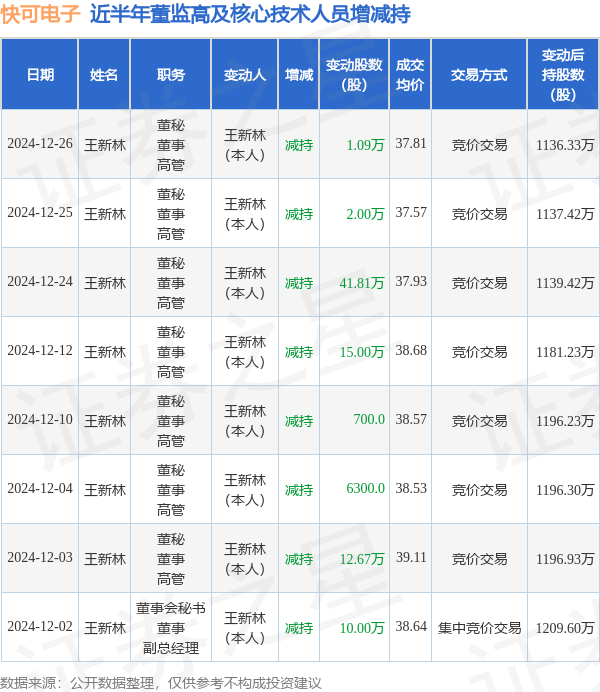 快可电子近半年内的董监高及核心技术人员增减持详情如下: