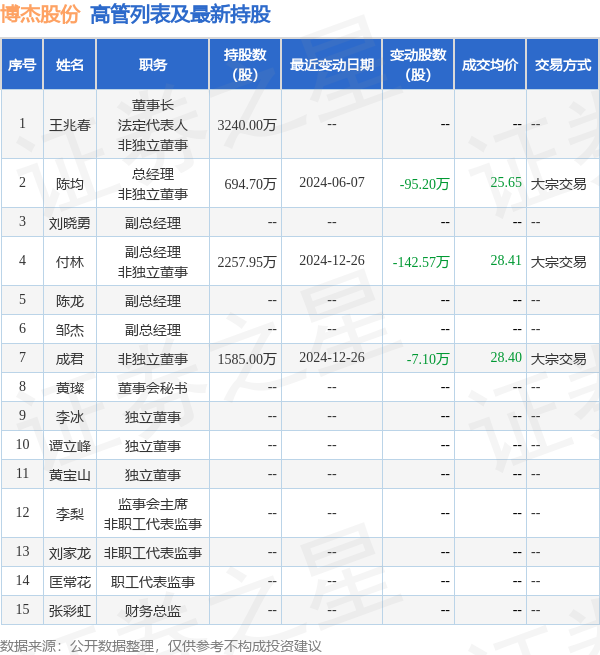 博杰股份近半年内的董监高及核心技术人员增减持详情如下: