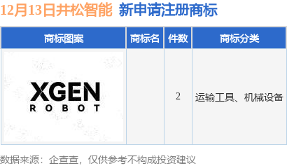 今年以来合肥井松智能科技股份有限公司新申请注册商标11件,截止目前公司共持有注册商标52件,另有11件商标尚在注册申请中。