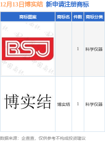 今年以来深圳市博实结科技股份有限公司新申请注册商标4件,截止目前公司共持有注册商标33件,另有4件商标尚在注册申请中。