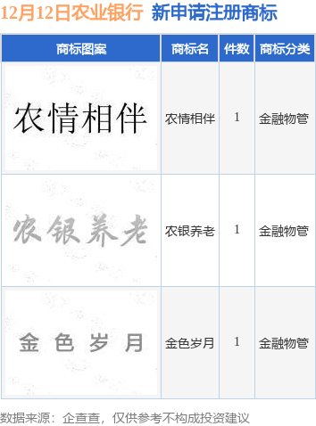 今年以来中国农业银行股份有限公司新申请注册商标69件,截止目前公司共持有注册商标2402件,另有153件商标尚在注册申请中。