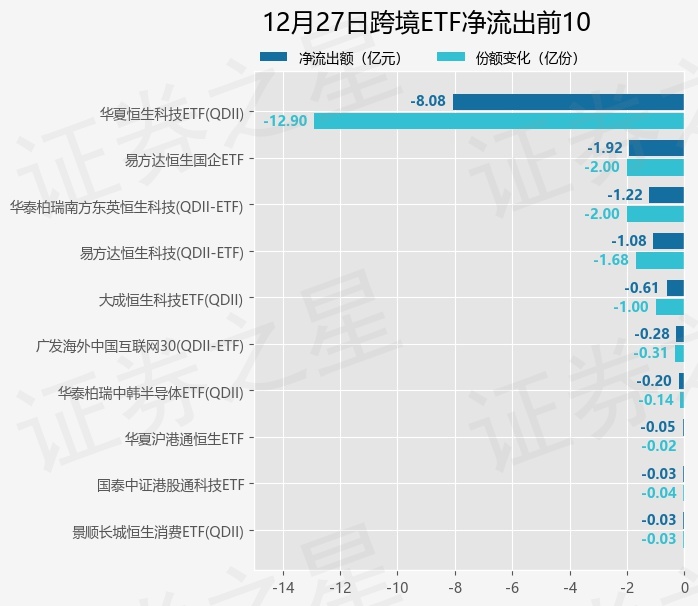 当日有18只跨境ETF基金出现资金净流出,其中净流出排首位的是华夏恒生科技ETF(QDII)(513180),份额减少了12.9亿份,净流出额为8.08亿元。