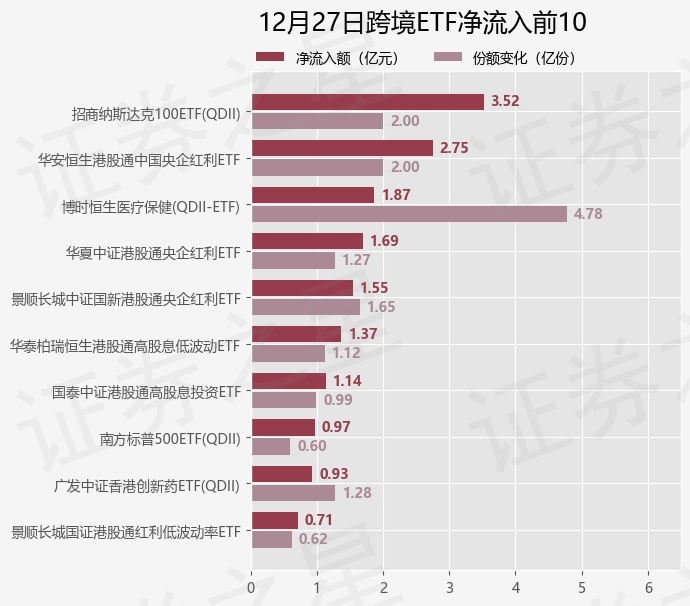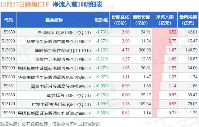 当日有54只跨境ETF基金出现资金净流入,其中净流入排首位的是招商纳斯达克100ETF(QDII)(159659),份额增加了2.0亿份,净流入额为3.52亿元。