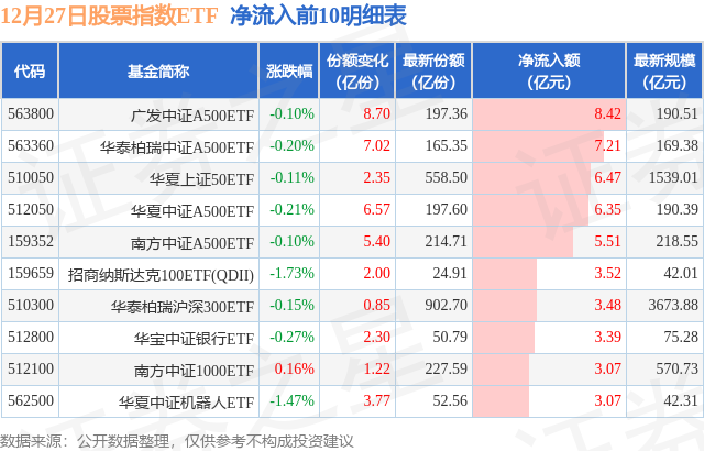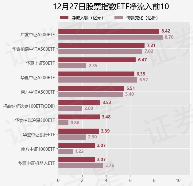 当日有225只股票指数ETF基金出现资金净流入,其中净流入排首位的是广发中证A500ETF(563800),份额增加了8.7亿份,净流入额为8.42亿元。