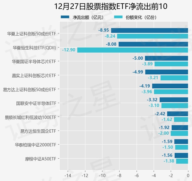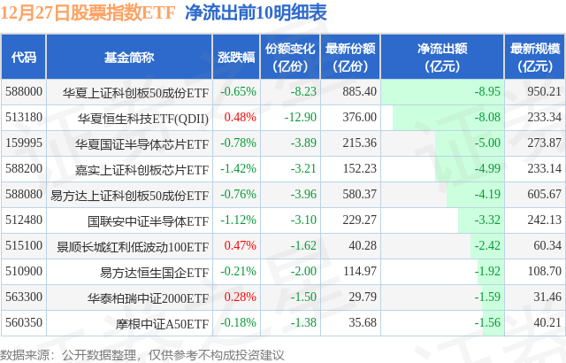 当日有233只股票指数ETF基金出现资金净流出,其中净流出排首位的是华夏上证科创板50成份ETF(588000),份额减少了8.23亿份,净流出额为8.95亿元。