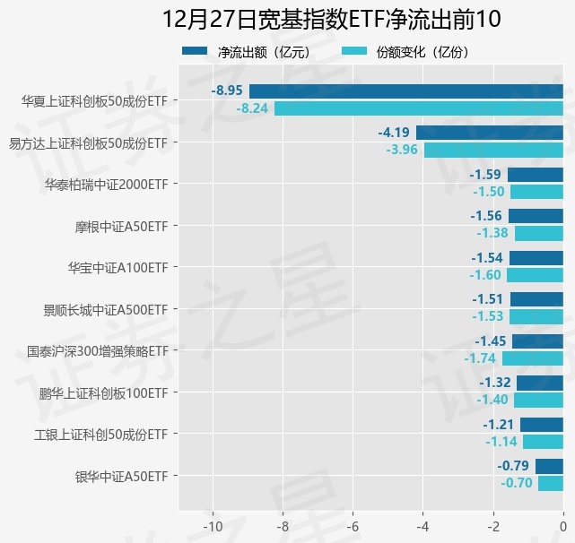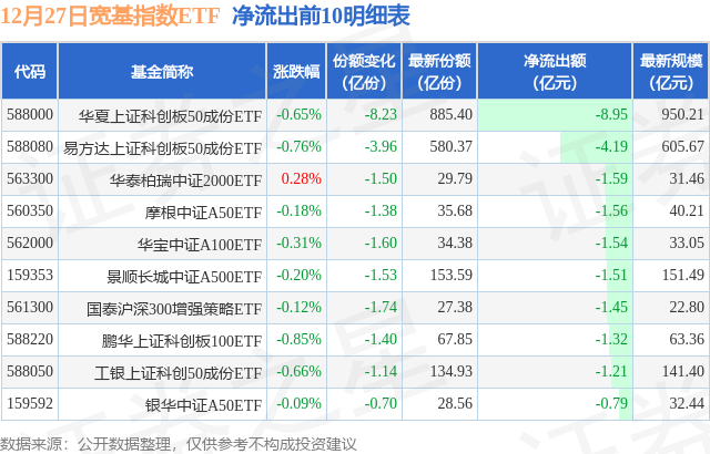 当日有71只宽基指数ETF基金出现资金净流出,其中净流出排首位的是华夏上证科创板50成份ETF(588000),份额减少了8.23亿份,净流出额为8.95亿元。