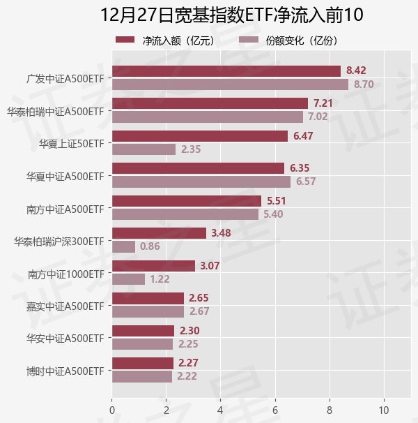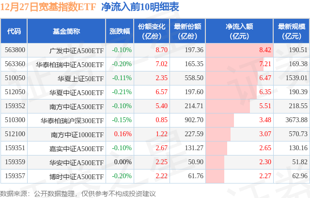 当日有45只宽基指数ETF基金出现资金净流入,其中净流入排首位的是广发中证A500ETF(563800),份额增加了8.7亿份,净流入额为8.42亿元。