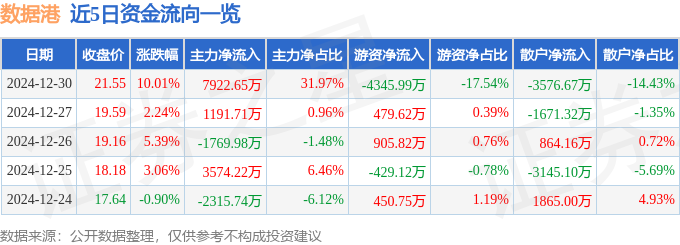 12月30日的资金流向数据方面,主力资金净流入7922.65万元,占总成交额31.97%,游资资金净流出4345.99万元,占总成交额17.54%,散户资金净流出3576.67万元,占总成交额14.43%。
