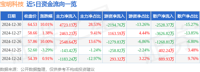 12月30日的资金流向数据方面,主力资金净流入4723.13万元,占总成交额28.53%,游资资金净流出2194.76万元,占总成交额13.26%,散户资金净流出2528.37万元,占总成交额15.27%。