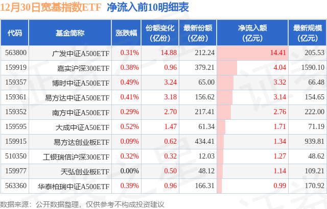 当日有34只宽基指数ETF基金出现资金净流入,其中净流入排首位的是广发中证A500ETF(563800),份额增加了14.88亿份,净流入额为14.41亿元。