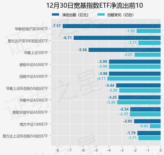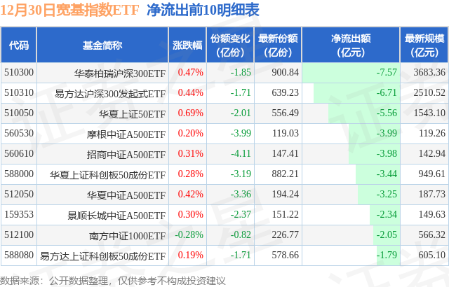 当日有76只宽基指数ETF基金出现资金净流出,其中净流出排首位的是华泰柏瑞沪深300ETF(510300),份额减少了1.85亿份,净流出额为7.57亿元。