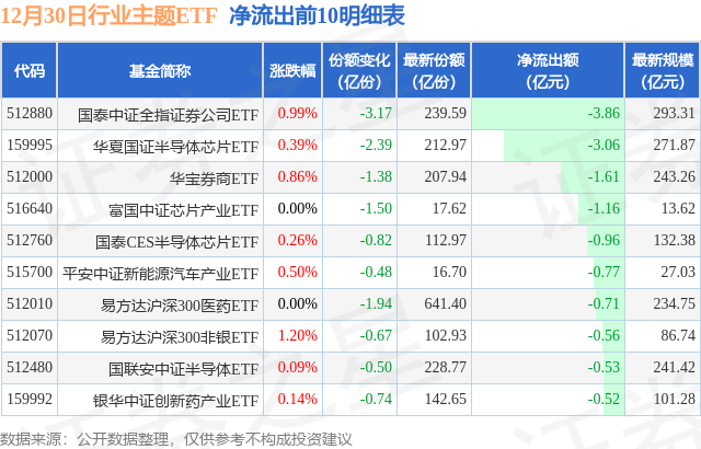 当日有133只行业主题ETF基金出现资金净流出,其中净流出排首位的是国泰中证全指证券公司ETF(512880),份额减少了3.17亿份,净流出额为3.86亿元。