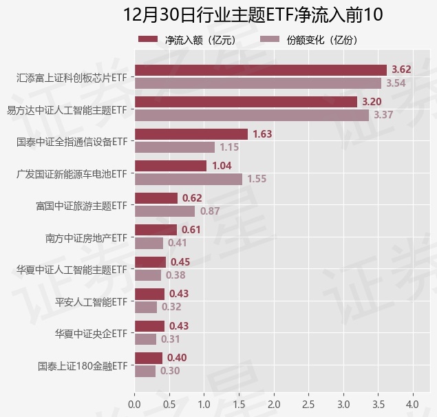 证券之星消息,12月30日行业主题ETF基金合计资金净流出3.85亿元,近5个交易日累计净流出10.57亿元,5个交易日中出现日合计资金净流出的有3天(ETF资金流向计算公式:(当日ETF场内流通份额-前一交易日ETF场内流通份额)*当日ETF均价,计算结果仅供参考)。
