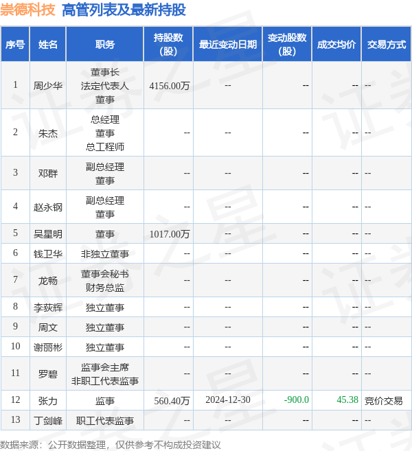 崇德科技近半年内的董监高及核心技术人员增减持详情如下: