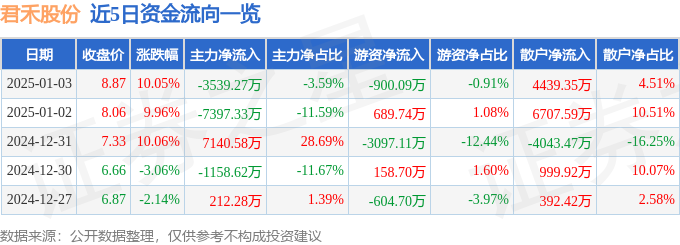 1月3日的资金流向数据方面,主力资金净流出3539.27万元,占总成交额3.59%,游资资金净流出900.09万元,占总成交额0.91%,散户资金净流入4439.35万元,占总成交额4.51%。