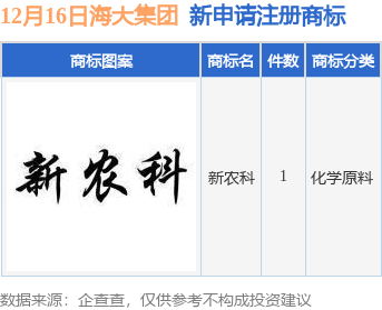 今年以来广东海大集团股份有限公司新申请注册商标0件,截止目前公司共持有注册商标915件,另有206件商标尚在注册申请中。