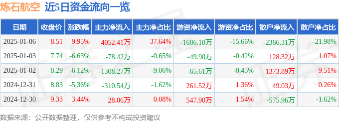 1月6日的资金流向数据方面,主力资金净流入4052.41万元,占总成交额37.64%,游资资金净流出1686.1万元,占总成交额15.66%,散户资金净流出2366.31万元,占总成交额21.98%。