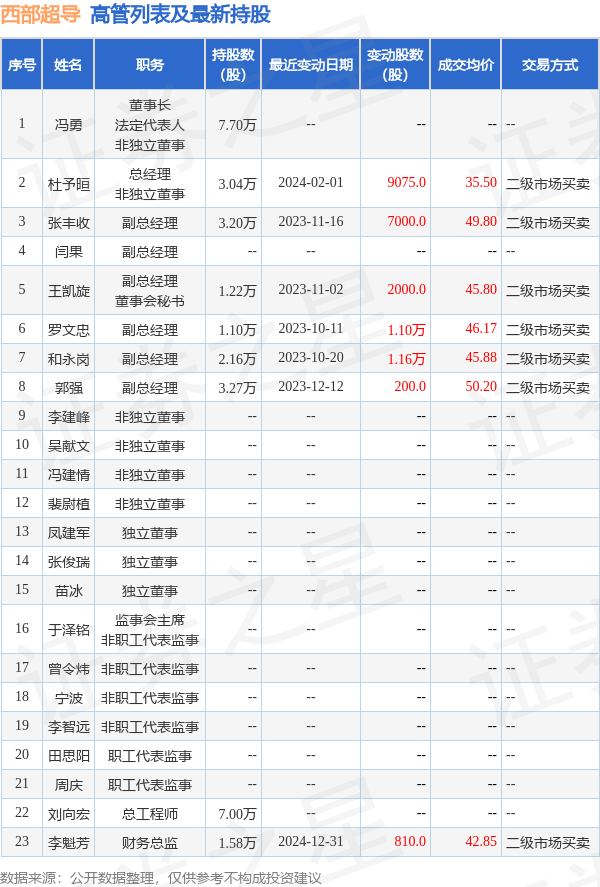 西部超导近半年内的董监高及核心技术人员增减持详情如下: