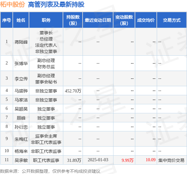 柘中股份近半年内的董监高及核心技术人员增减持详情如下: