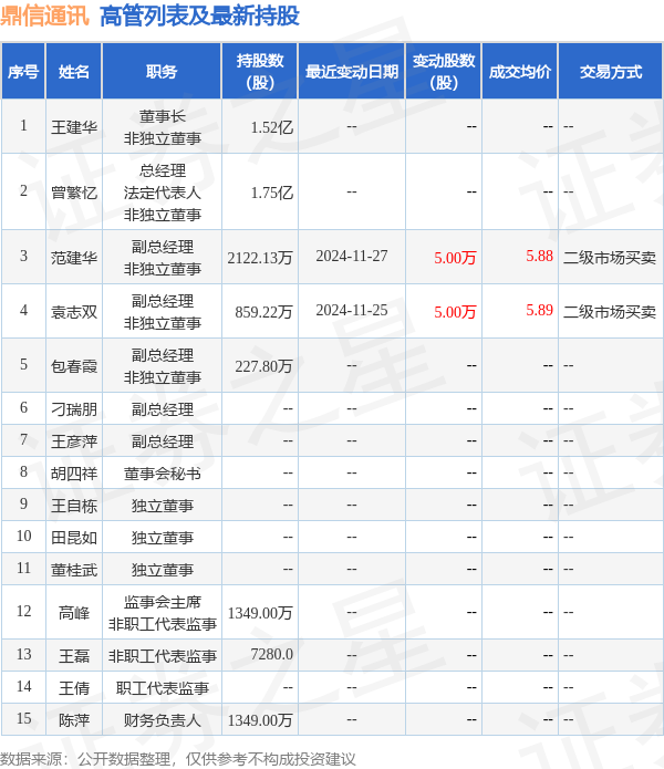 鼎信通讯的高管列表及最新持股情况如下: