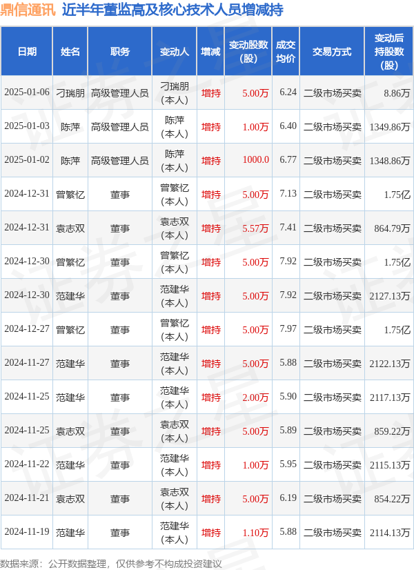 鼎信通讯近半年内的董监高及核心技术人员增减持详情如下: