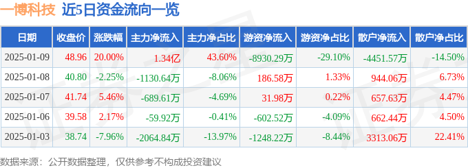 1月9日的资金流向数据方面,主力资金净流入1.34亿元,占总成交额43.6%,游资资金净流出8930.29万元,占总成交额29.1%,散户资金净流出4451.57万元,占总成交额14.5%。