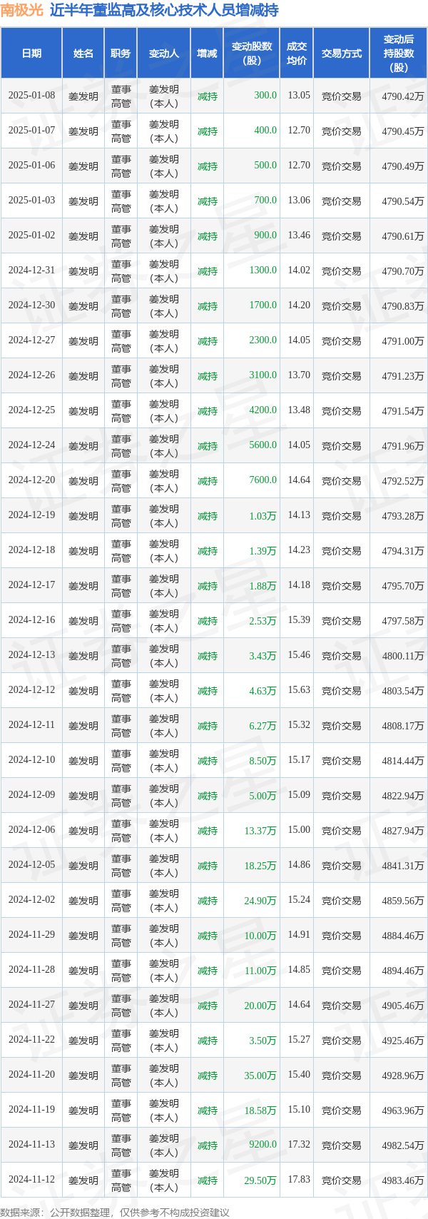 南极光近半年内的董监高及核心技术人员增减持详情如下: