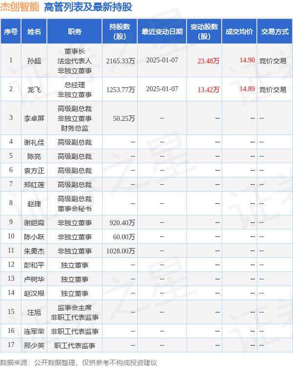 杰创智能的高管列表及最新持股情况如下: