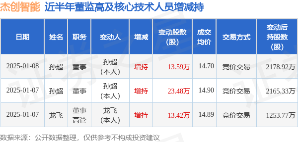杰创智能近半年内的董监高及核心技术人员增减持详情如下: