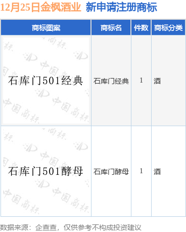 今年以来上海金枫酒业股份有限公司新申请注册商标0件,截止目前公司共持有注册商标390件,另有10件商标尚在注册申请中。