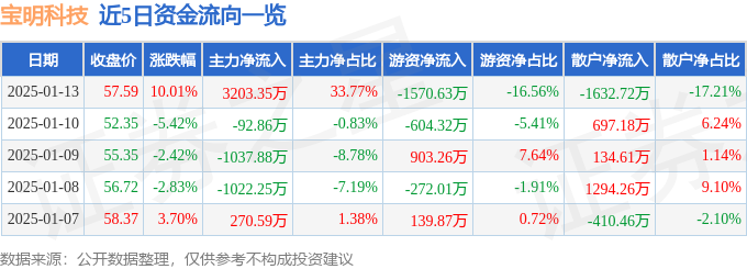 1月13日的资金流向数据方面,主力资金净流入3203.35万元,占总成交额33.77%,游资资金净流出1570.63万元,占总成交额16.56%,散户资金净流出1632.72万元,占总成交额17.21%。