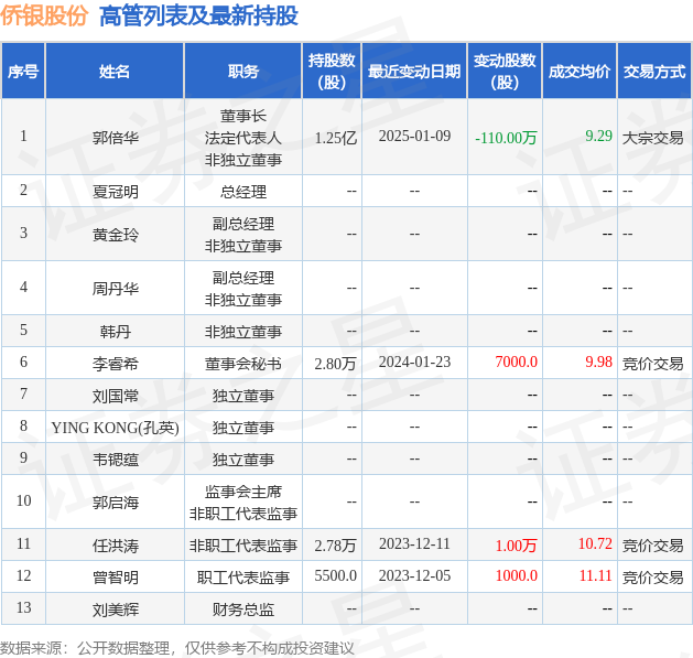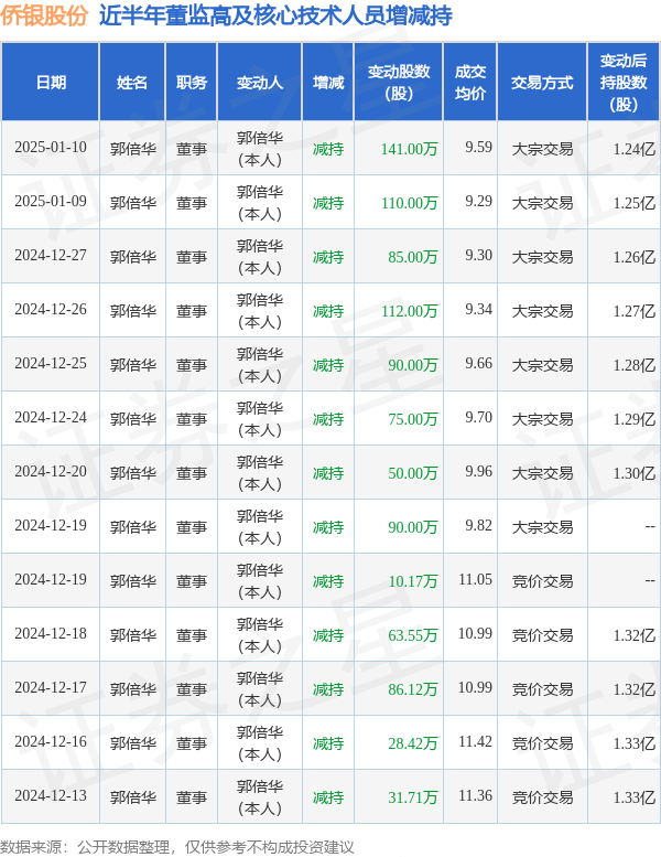 侨银股份近半年内的董监高及核心技术人员增减持详情如下: