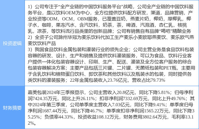 该股为包装印刷,植物奶,饮料概念热股,当日包装印刷概念上涨4.89%,植物奶概念上涨4.13%,饮料概念上涨3.56%。